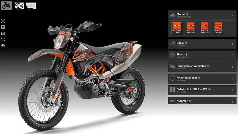 As an official KTM licensee since 2008, we produce high-quality graphics kits in-house – precise, durable and built for real off-road use. Our KTM 690 enduro graphics kits are tailored exactly to the 2008–2018 model years and impress with accurate fit, vibrant colors and a finish that shrugs off tough enduro stages. With our online configurator you design your KTM 690 enduro graphics kits in real time – no long email back-and-forth, with a 100% accurate preview on your bike.