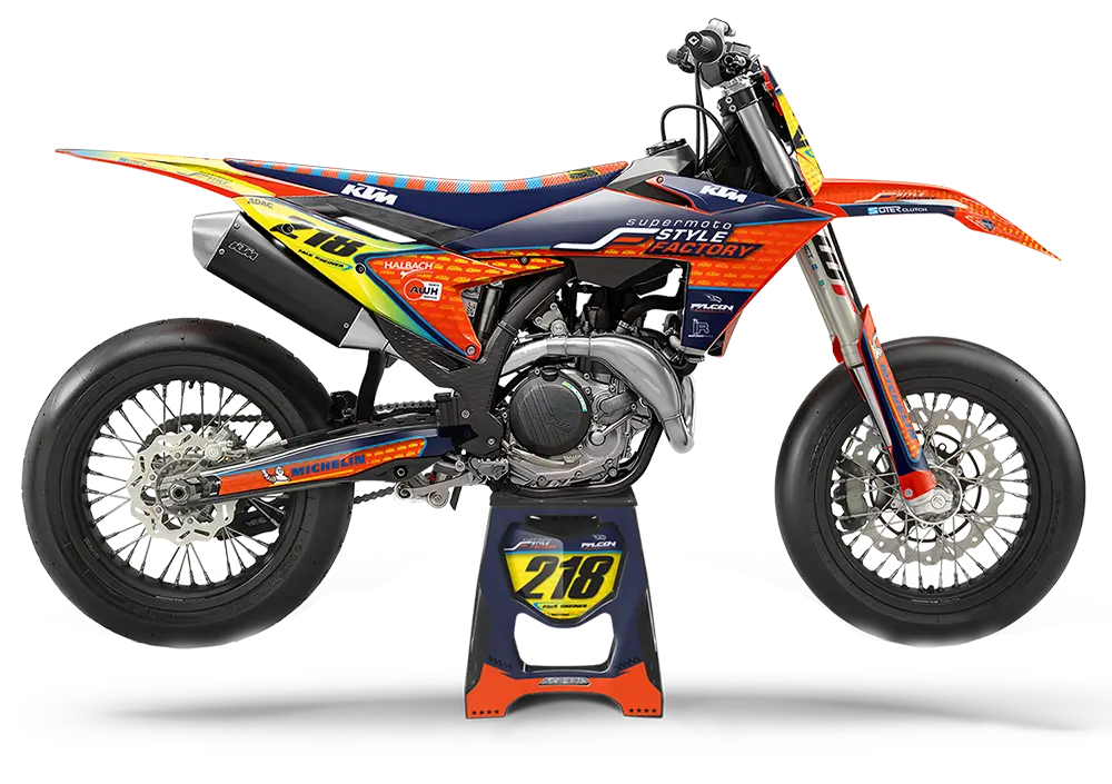 A KTM Supermoto graphic with a shiny holographic style in orange and black.