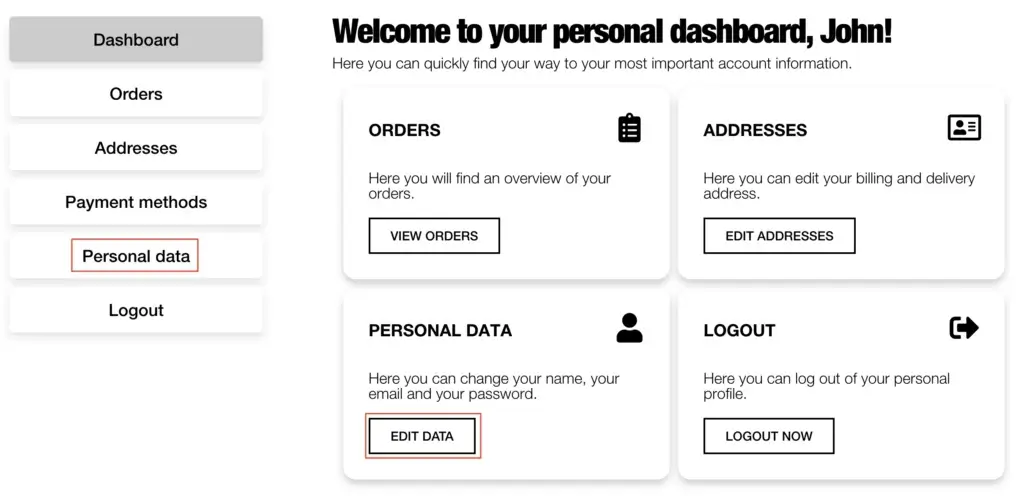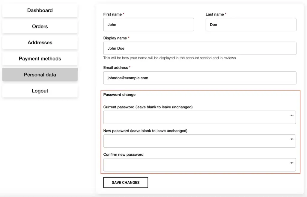 Click on the user icon in the top right corner of the header and log in with your details. You will then be automatically redirected to your dashboard. In the dashboard, click on “Personal Data.” You can also click on the “Personal Data” tab. There, you can change both your password and personal details. To change your password, first enter your current password. Then, enter a new password. After that, confirm your new password and click “Save Changes.” The fields for first name, last name, display name, and email address can remain unchanged.