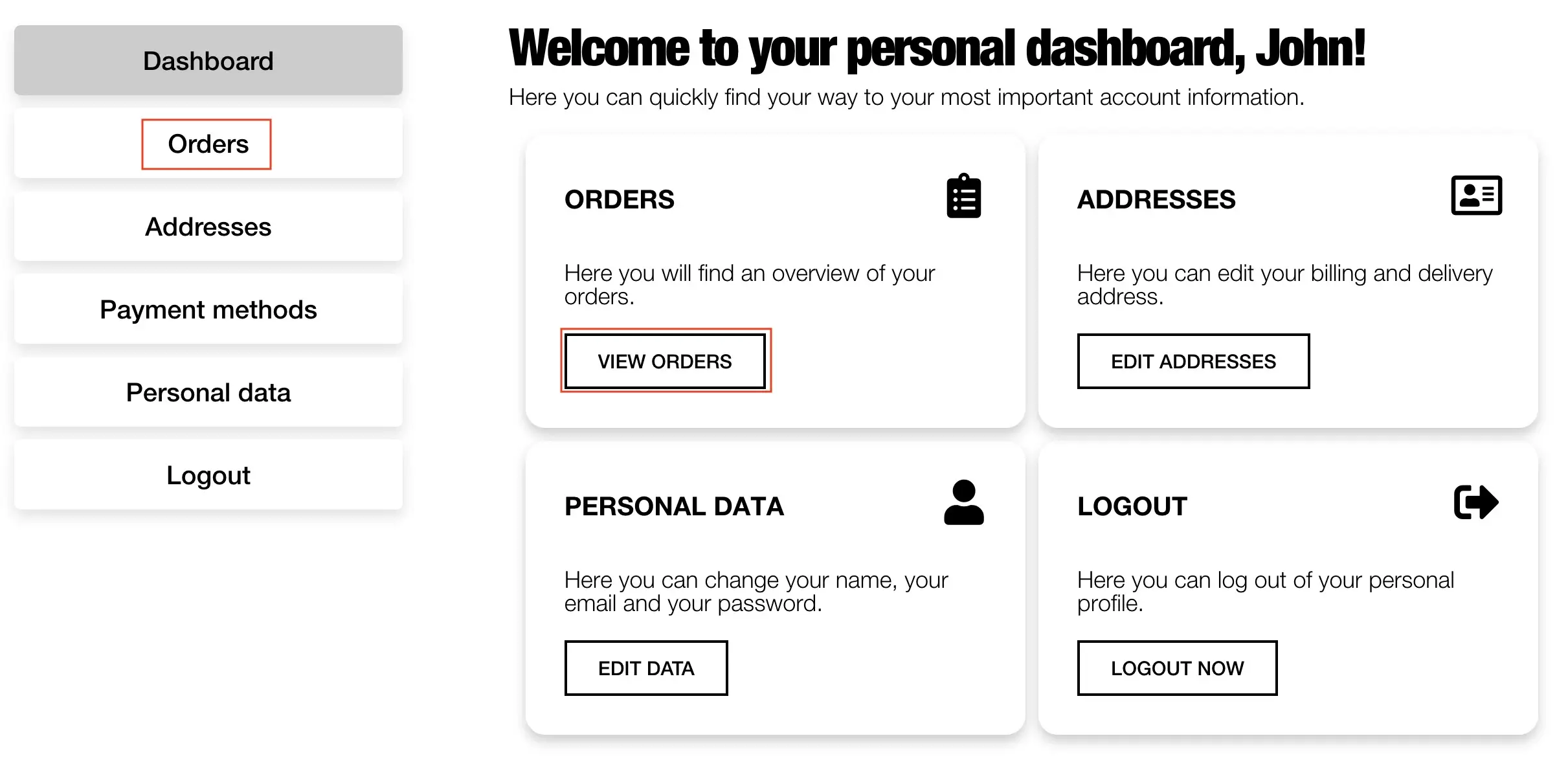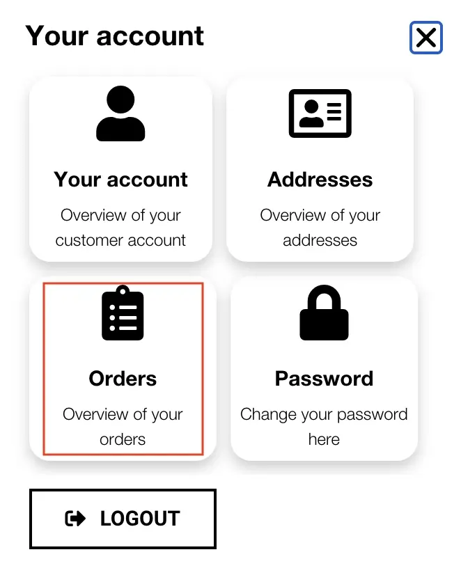 Click on the user icon in the upper right corner of the header and log in with your credentials. You will be automatically redirected to your dashboard. In the dashboard, you can click on “View Orders.” You can also click on the “Orders” tab to access the overview of your orders.
