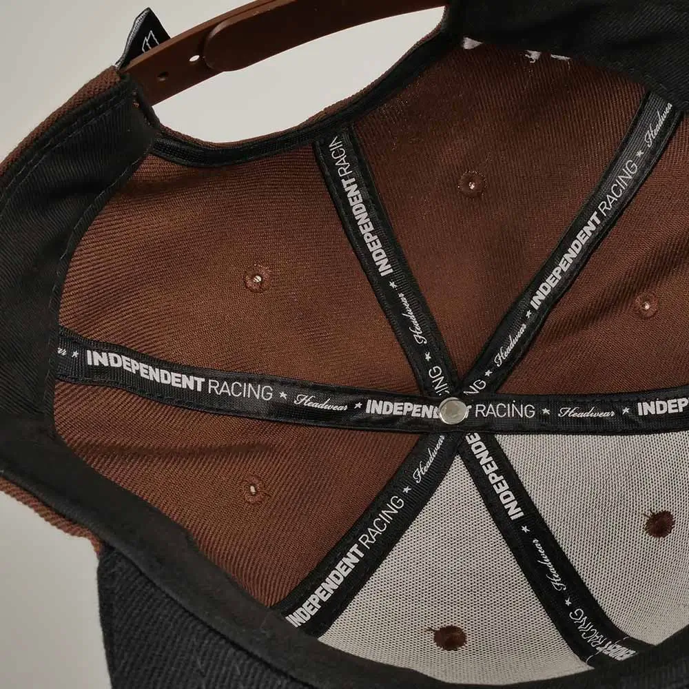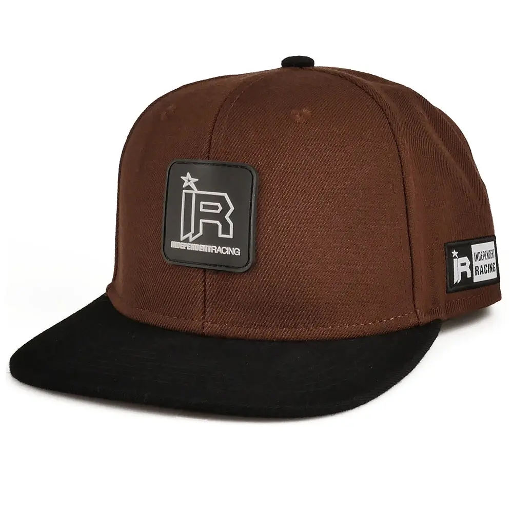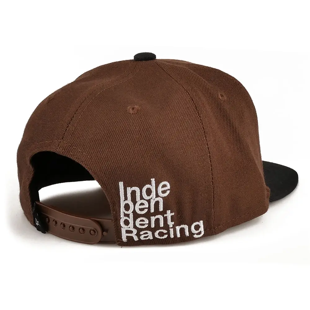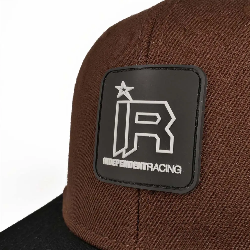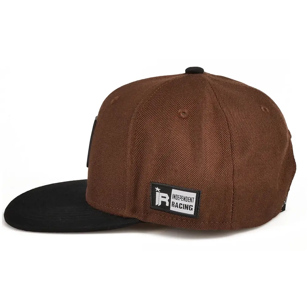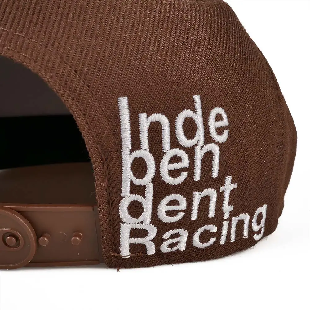 Brown and black snapback with black and white Independent Racing rubber logo. The flat, black peak stands out against the brown cap. White, modern Independent Racing lettering on the back, which is embroidered on the cap. In addition, the cap is finished with a woven, black and white Independent Racing patch on the left side. The cap is adjustable through the snapback on the back.