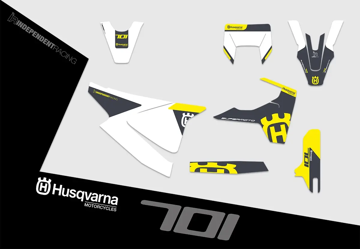 Our Husqvarna 701 Supermoto graphics are truly special, highly durable, and flexible stickers with optimal adhesive strength. The graphics kit arrives at your doorstep as individually cut pieces tailored to fit specific areas – making the application a breeze as you align them with your fairing parts. In contrast to complete wrapping, as you might know from cars, the stickers do not have to be pulled and then cut, but fits directly.