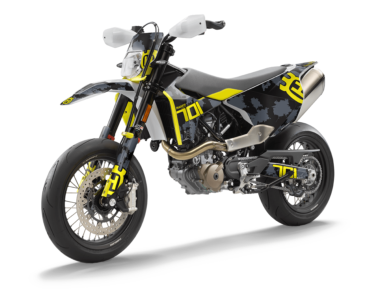 The Husqvarna 701 SM is available in three different models: 701 SM 2016 – 2019, 701 SM 2020 – 2022, and 701 SM 2023. It’s important to know that all models are completely identical, only the handguards and the colors of the plastic parts differ. So, the decal will definitely fit your bike if you choose the right model. The selection of the model does not affect the design of the decal. In the configurator, you can choose between these three models.