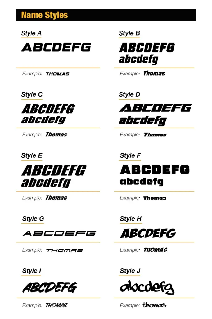 You can choose from ten different fonts for both the name and number – Styles A through J. Some fonts support only uppercase or lowercase letters, while others support both. You can preview the fonts in the configurator. Additionally, you can freely choose colors for the name and number from a wide color palette. Please note that there may be slight color variations in printing, meaning the printed colors may differ slightly from those on the screen. Our designers always adjust the colors to match the rest of the design perfectly.