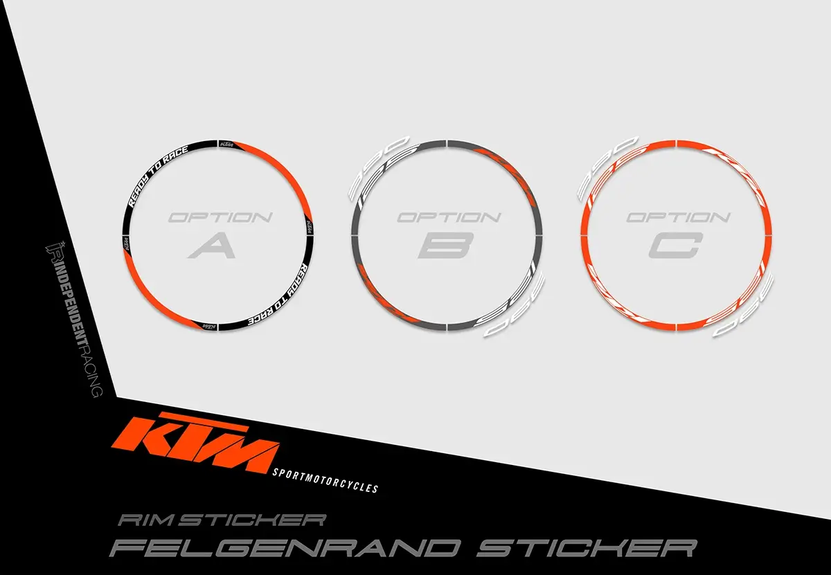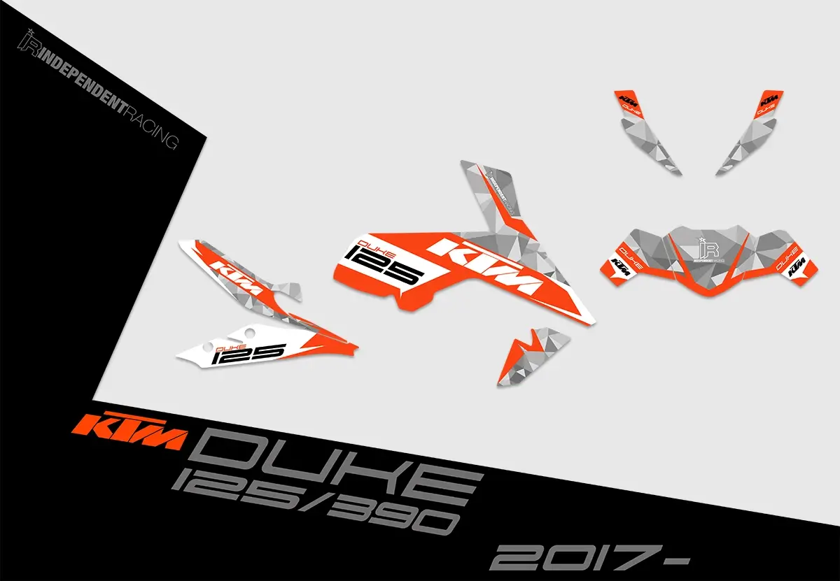 The KTM Duke 125/390 from 2017 is available in different models. It’s important to know that all models are completely identical; only the colors of the plastic parts differ. So, the graphics will definitely fit your bike. In the configurator, you can choose between these models. Depending on which model you select, either 125 or 390 will be visible on the graphics. Therefore, choose the appropriate model.