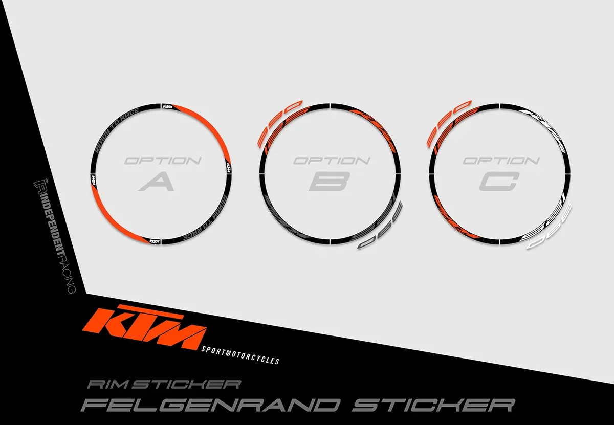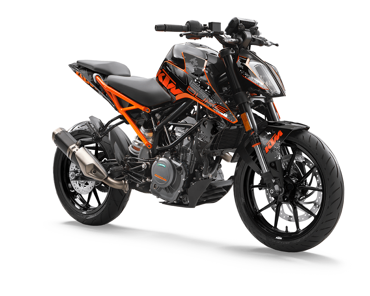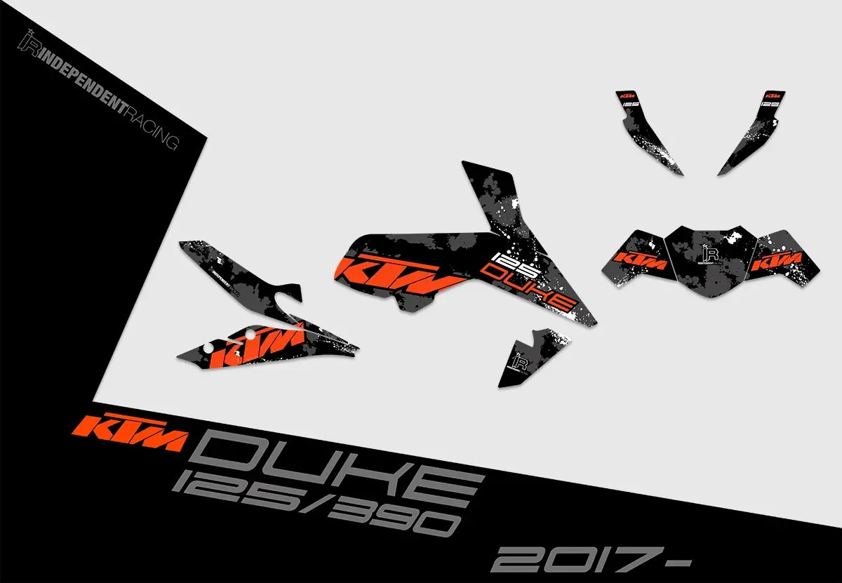 The KTM Duke 125/390 from 2017 is available in different models. It’s important to know that all models are completely identical; only the colors of the plastic parts differ. So, the graphics will definitely fit your bike. In the configurator, you can choose between these models. Depending on which model you select, either 125 or 390 will be visible on the graphics. Therefore, choose the appropriate model.