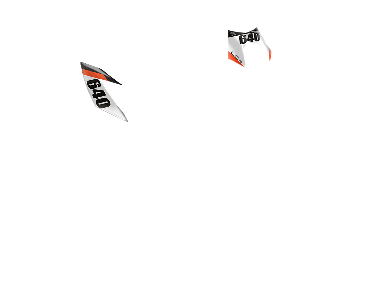 Our KTM LC4 graphics are truly special, highly durable, and flexible stickers with optimal adhesive strength. The graphics kit arrives at your doorstep as individually cut pieces tailored to fit specific areas – making the application a breeze as you align them with your fairing parts. In contrast to complete wrapping, as you might know from cars, the stickers do not have to be pulled and then cut, but fits directly.