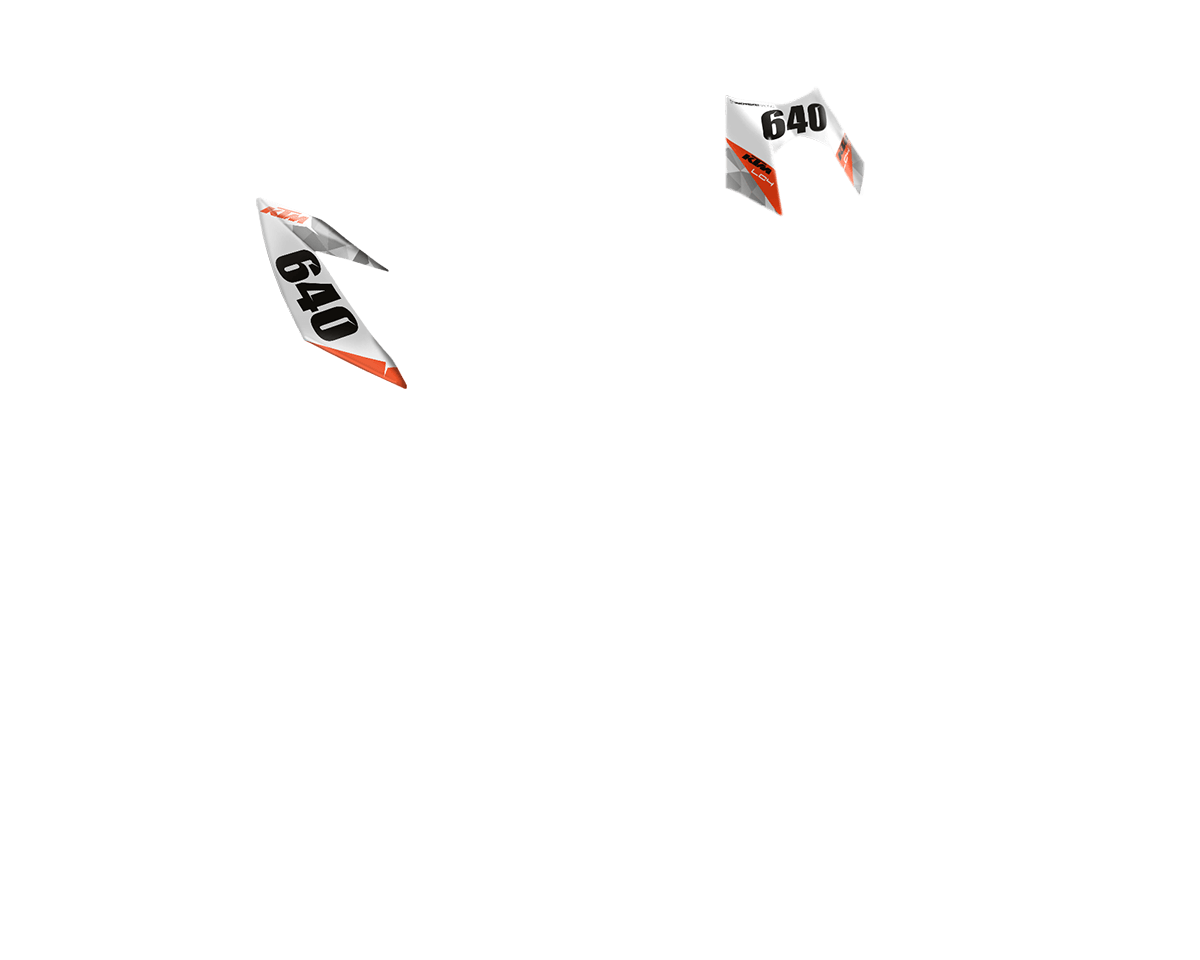 Our KTM LC4 graphics are truly special, highly durable, and flexible stickers with optimal adhesive strength. The graphics kit arrives at your doorstep as individually cut pieces tailored to fit specific areas – making the application a breeze as you align them with your fairing parts. In contrast to complete wrapping, as you might know from cars, the stickers do not have to be pulled and then cut, but fits directly.