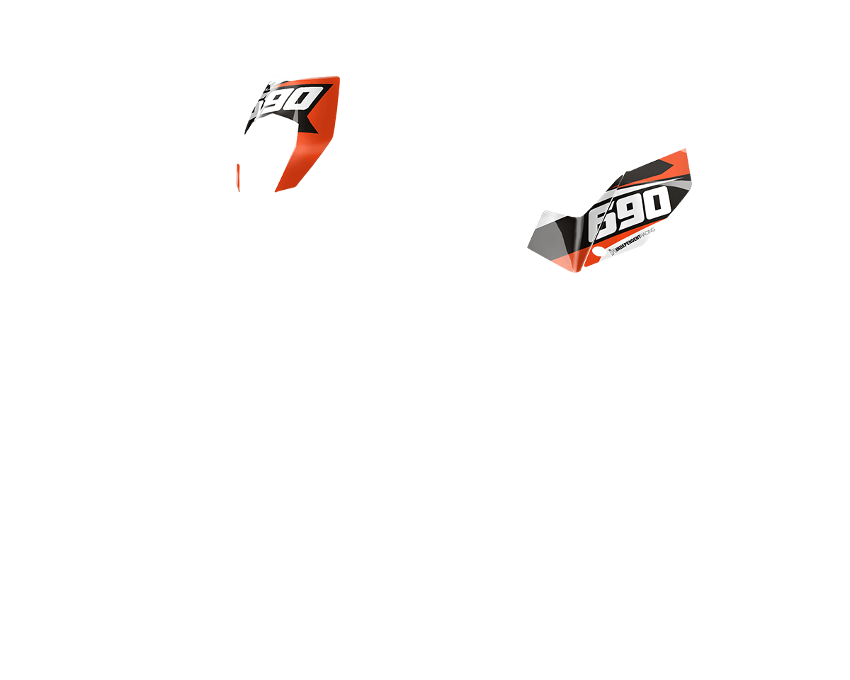 Our KTM 690 SMC/R graphics are truly special, highly durable, and flexible stickers with optimal adhesive strength. The graphics kit arrives at your doorstep as individually cut pieces tailored to fit specific areas – making the application a breeze as you align them with your fairing parts. In contrast to complete wrapping, as you might know from cars, the stickers do not have to be pulled and then cut, but fits directly. Due to our unique film thickness (0.8 mm), achieving complete edge-to-edge coverage on all surfaces of the fairing might be challenging. As a result, some parts of the fairing will remain visible The product image closely resembles reality, providing a reliable guide for application!