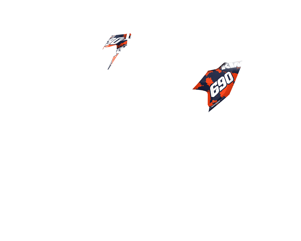 Our KTM 690 SMC/R graphics are truly special, highly durable, and flexible stickers with optimal adhesive strength. The graphics kit arrives at your doorstep as individually cut pieces tailored to fit specific areas – making the application a breeze as you align them with your fairing parts. In contrast to complete wrapping, as you might know from cars, the stickers do not have to be pulled and then cut, but fits directly. Due to our unique film thickness (0.8 mm), achieving complete edge-to-edge coverage on all surfaces of the fairing might be challenging. As a result, some parts of the fairing will remain visible The product image closely resembles reality, providing a reliable guide for application!