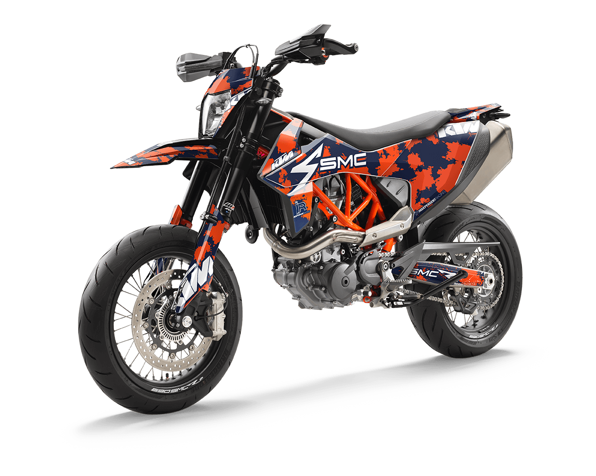 The KTM SMCR from 2019 is available in three different models. It’s important to know that all models are completely identical; only the colors of the plastic parts differ. So, the graphic will definitely fit your bike. In the configurator, you can choose between these three models. This is just for better visualization. It helps you imagine how the graphics will look on your bike more easily. The selection of the model does not affect the design of the graphic kit.