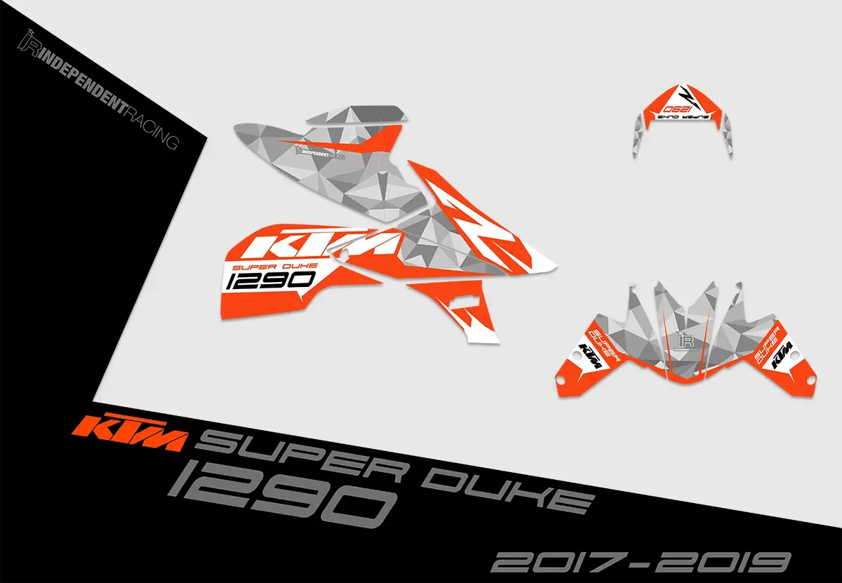 The KTM Superduke 1290 2017-2019 is available in different models: 2017 black, 2017 black/orange, 2017-2018 white, 2019 white. It’s important to know that all models are completely identical in construction; only the colors of the plastic parts differ. Therefore, the graphics will fit your bike regardless. This is just for better visualization. It helps you imagine how the graphics looks on your bike more easily. The selection of the model does not change the design of the graphic kit. In the configurator, you can choose between these four models.