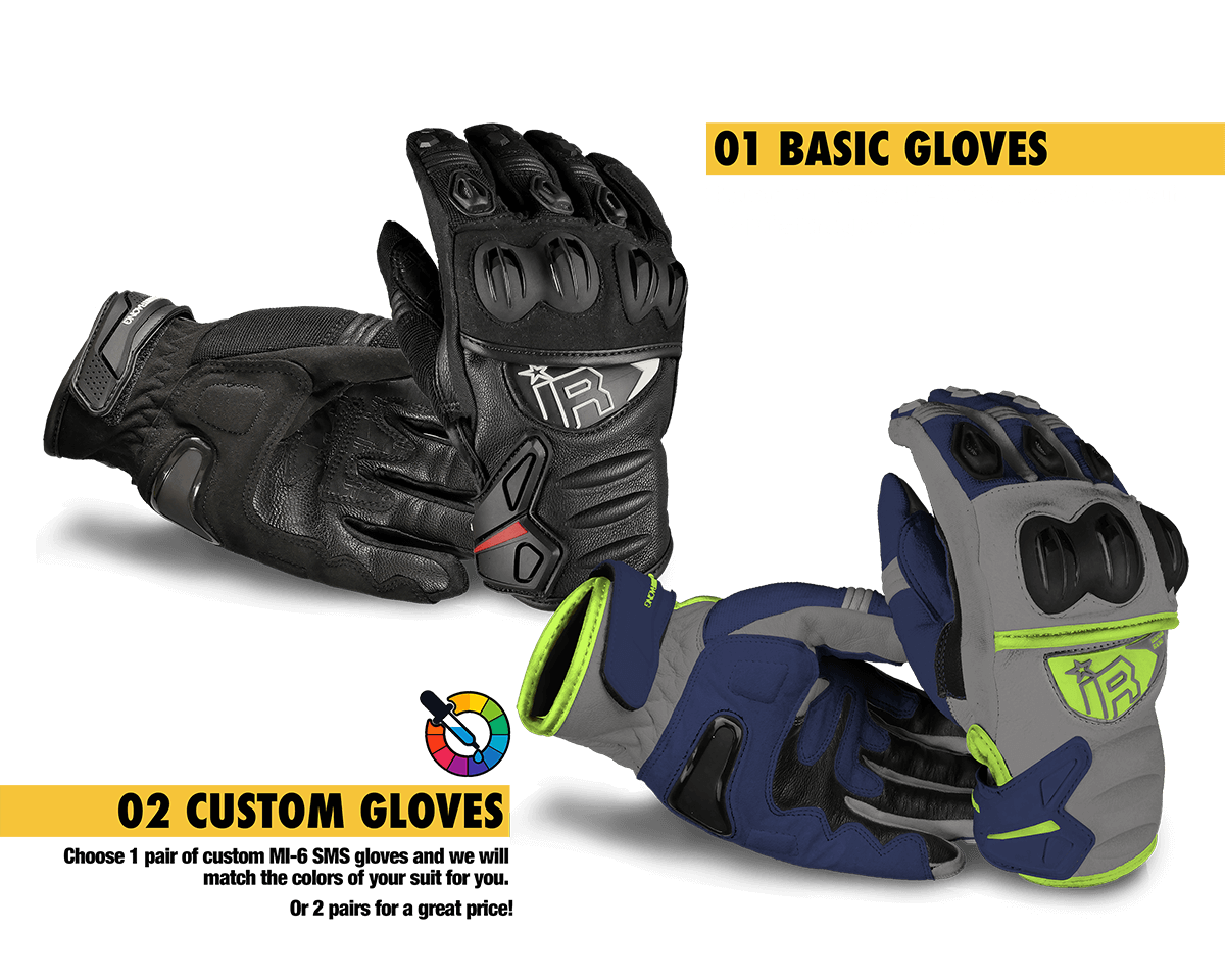 Our SMG Supermoto gloves are the perfect complement to our suit. You can choose between black gloves, which match all color combinations, and custom gloves. If you choose custom gloves, our designers will create the gloves to match your leather suit design. You can also choose how many gloves you would like to order.