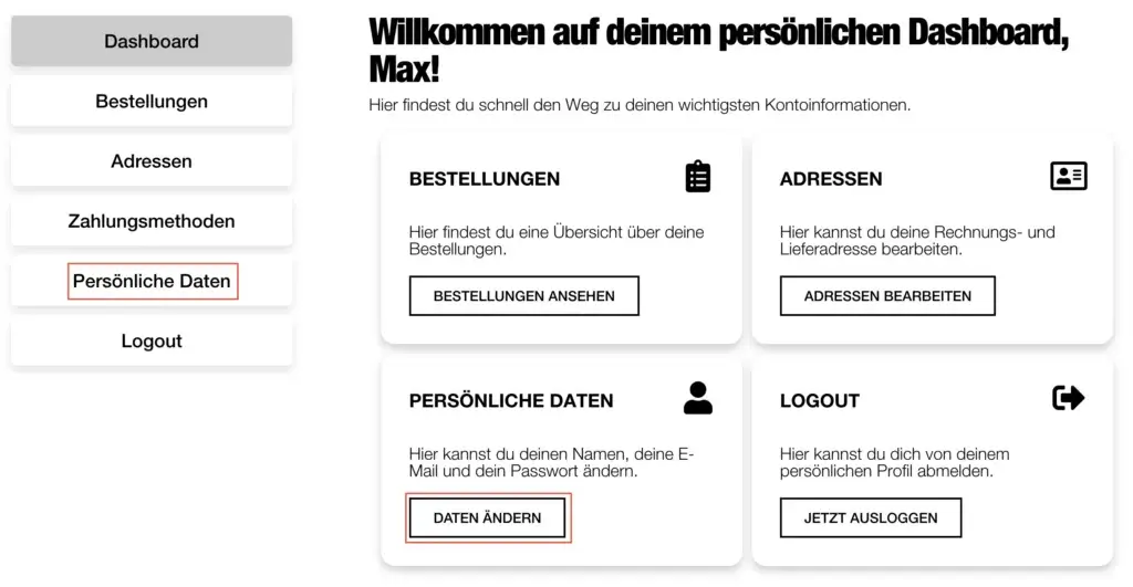 Es gibt verschiedene Möglichkeiten, um auf die Seite zu gelangen, auf der du dein Passwort bearbeiten kannst. Grundsätzlich kannst du sie im „Dein Konto“-Bereich unseres Online-Shops finden.