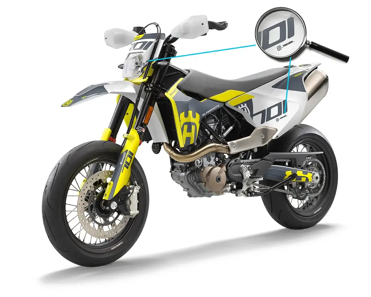 Die Husqvarna 701 SM ist in drei verschiedenen Modellen erhältlich: 701 SM 2016 – 2019, 701 SM 2020 – 2022 und 701 SM 2023. Wichtig dabei ist zu wissen, dass alle Modelle komplett baugleich sind, lediglich die Handschalen und die Farben der Plastikteile unterscheiden sich. Das Dekor passt also auf jeden Fall auf dein Bike, wenn du das richtige Modell auswählst. Am Design ändert die Auswahl des Modells nichts. Im Konfigurator kannst du zwischen diesen drei Modellen auswählen.
