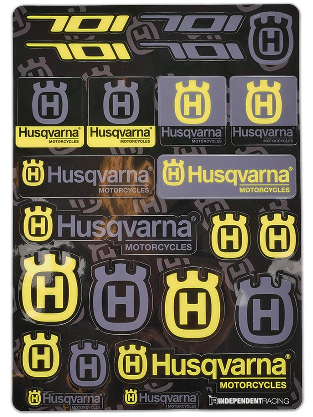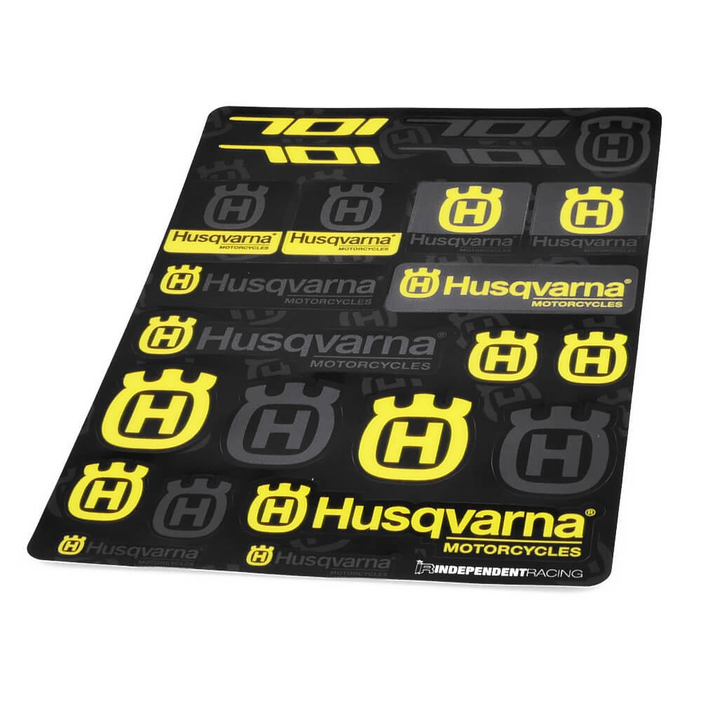 Der Aufkleberbogen im DIN A4-Format besteht aus 23 einzelnen Husqvarna Aufklebern in verschiedenen Größen, Formen und Farben. Mit dabei sind die klassischen Husqvarna Motorcycles Logos als auch 701 Schriftzüge.