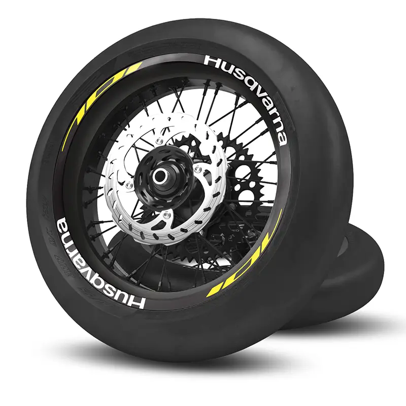 Farblich passen unsere Felgenaufkleber „Stock 1C“ zu allen Husqvarna Dekoren in den Farben schwarz, weiß und gelb.
