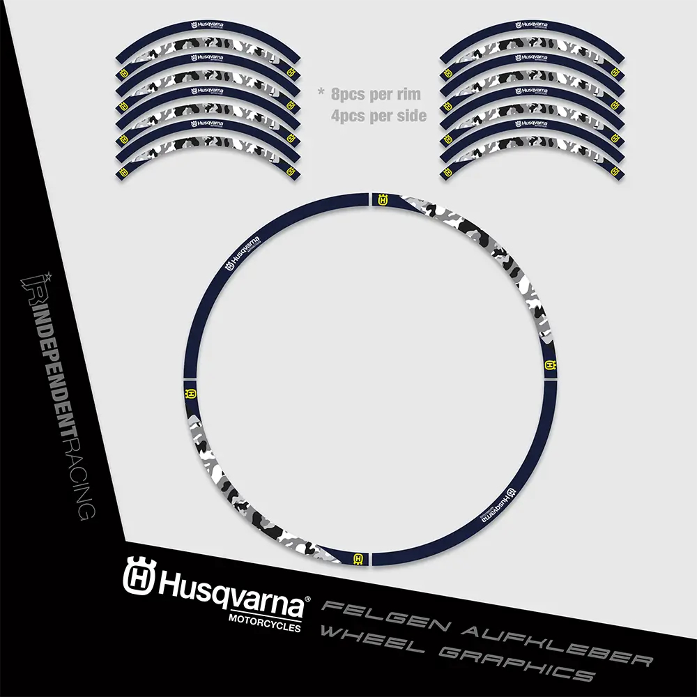 Farblich passen unsere Felgenaufkleber „Works 4A“ zu allen Husqvarna Dekoren in den Farben blau, grau und gelb.