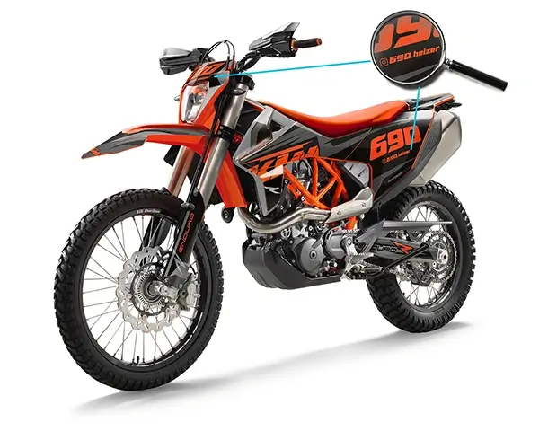 Unsere KTM 690 Enduro R Dekore sind ganz besondere, sehr haltbare und flexible Aufkleber mit optimaler Haftkraft. Das Dekor kommt bei dir als in passende Formen geschnittene Einzelteile an – so musst du dich nur an deinen Verkleidungsteilen orientieren und das Bekleben ist spielend einfach. Anders als bei einer Komplettfolierung, wie man es vielleicht von Autos kennt, muss die Folie nicht gezogen und dann zugeschnitten werden, sondern passt direkt. Es werden immer Teile der Verkleidung zu sehen sein, da es bei unserer besonderen Folienstärke (0,8 mm) nicht einfach bis gar nicht zu realisieren wäre, alle Kanten zu verkleben. Das Produktbild kommt der Realität sehr nah, hier kannst du dich gut orientieren!
