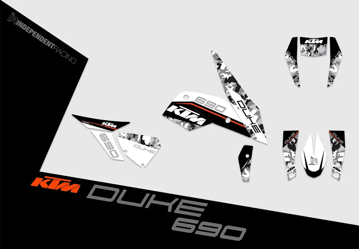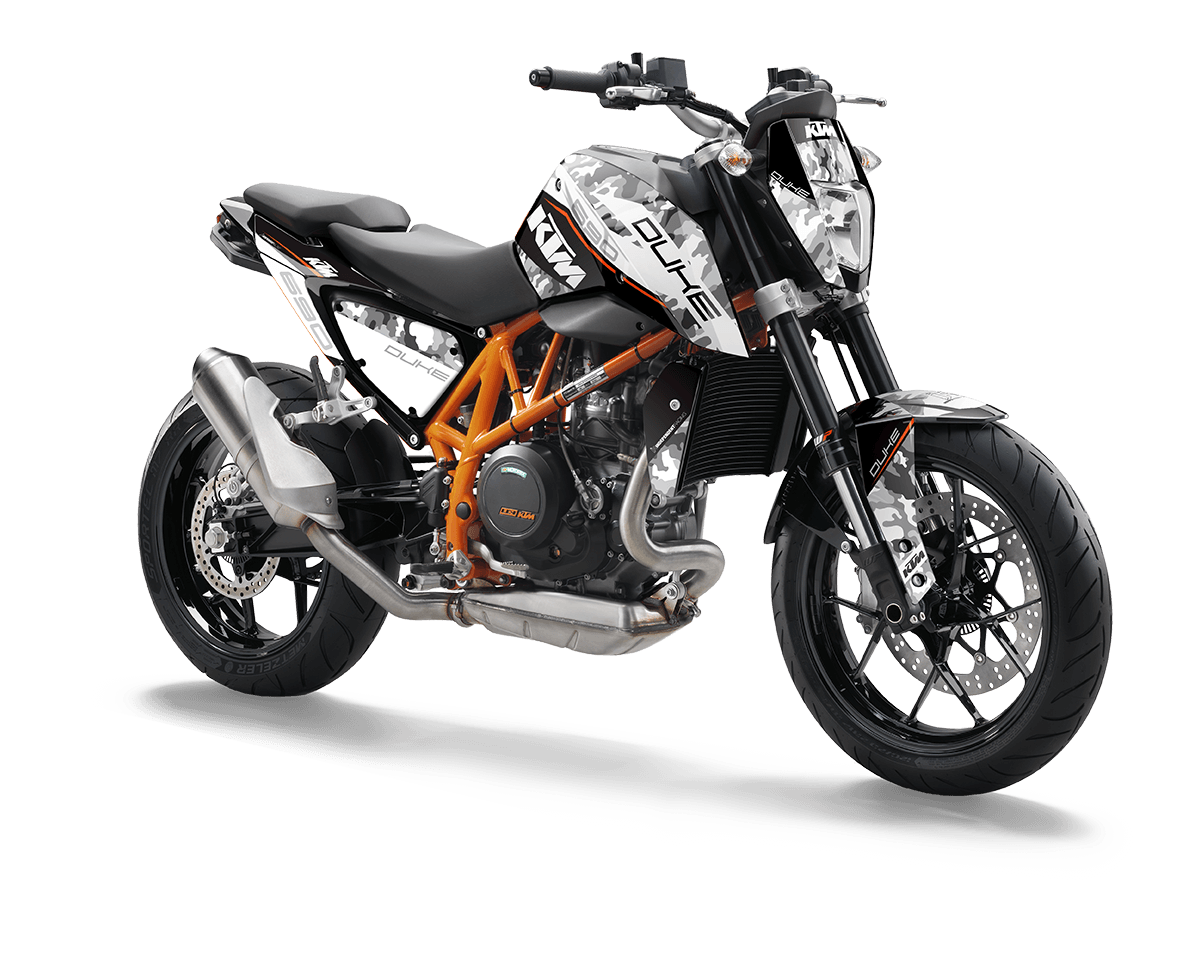 Die KTM Duke 690 ist in vier verschiedenen Modellen erhältlich: Orange/Schwarz, Orange/Weiß, Schwarz/Orange und Schwarz/Weiß. Wichtig dabei ist zu wissen, dass alle Modelle komplett baugleich sind, lediglich die Farben der Plastikteile unterscheiden sich. Das Dekor passt also auf jeden Fall auf dein Bike. Dies dient nur der besseren Ansicht. So kannst du dir einfacher vorstellen, wie das Dekor auf deinem Bike aussieht. Am Dekor ändert die Auswahl des Modells nichts. Im Konfigurator kannst du zwischen diesen vier Modellen auswählen.