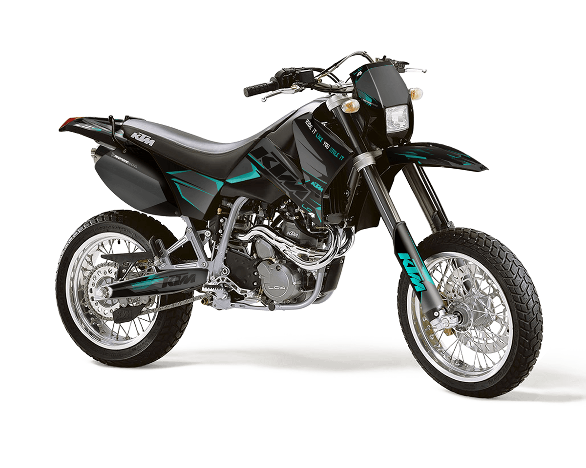 Die KTM LC4 ist in zwei verschiedenen Modellen erhältlich. Wichtig dabei ist zu wissen, dass alle Modelle komplett baugleich sind, lediglich die Farben der Plastikteile unterscheiden sich. Das Dekor passt also auf jeden Fall auf dein Bike. Dies dient nur der besseren Ansicht. So kannst du dir einfacher vorstellen, wie das Dekor auf deinem Bike aussieht. Am Dekor ändert die Auswahl des Modells nichts. Im Konfigurator kannst du zwischen diesen zwei Modellen auswählen.