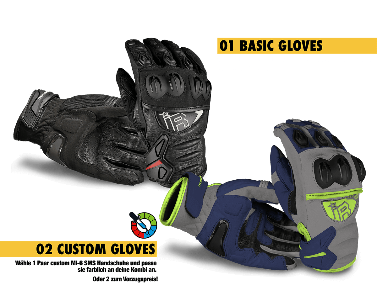 Die perfekte Ergänzung zu unserer Kombi sind unsere SMG Supermoto Handschuhe. Du kannst zwischen schwarzen Handschuhen, die zu allen Farbkombinationen passen, und Custom Handschuhen auswählen. Wenn du Custom Handschuhe auswählst, dann werden unsere Designer die Handschuhe passend zu deinem Lederkombi-Design erstellen. Wähle auch aus, wie viele Handschuhe du mitbestellen möchtest.